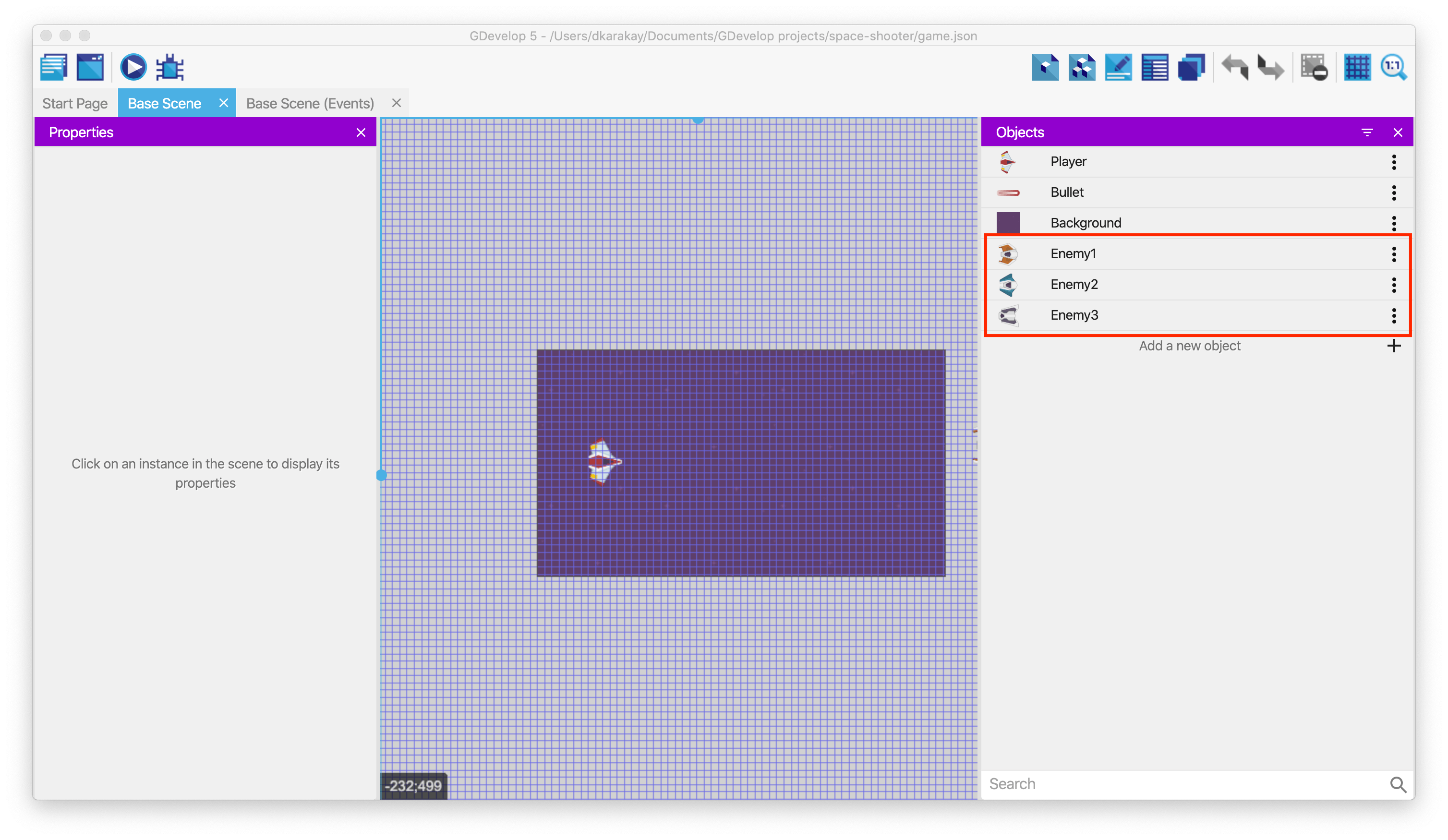 We'll now create an object group called "Enemies". This will be useful in events, to refer to all the objects in the group without repeating events for each object.